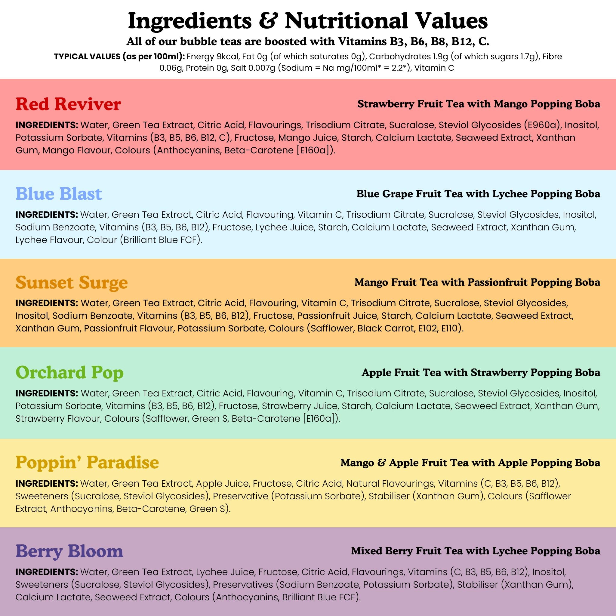 Poppin' Paradise (Mango and Apple Tea with Apple Popping Boba) - Water, Green Tea Extract, Apple Juice, Fructose, Citric Acid, Natural Flavourings, Vitamins (C, B3, B5, B6, B12), Sweeteners (Sucralose, Steviol Glycosides), Preservative (Potassium Sorbate), Stabiliser (Xanthan Gum), Colours (Safflower Extract, Anthocyanins, Beta-Carotene, Green S).